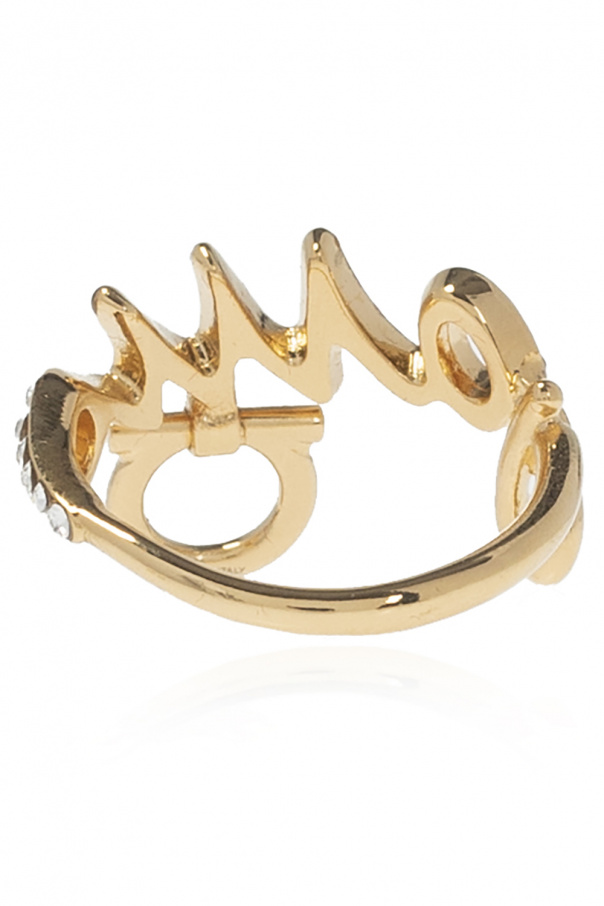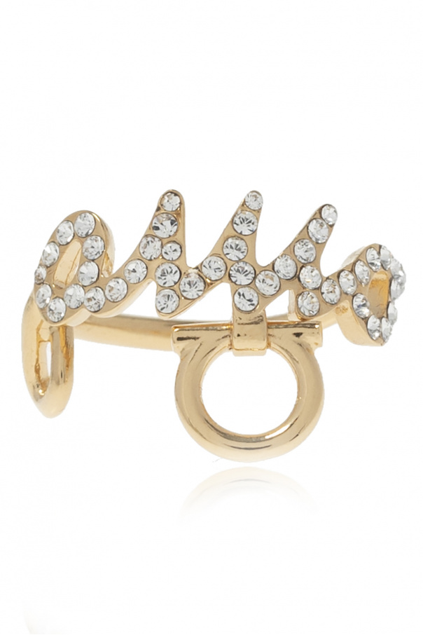 Gold-tone ring from Salvatore Ferragamo. Made of brass, this item features glass crystals and a moving Gancini element.