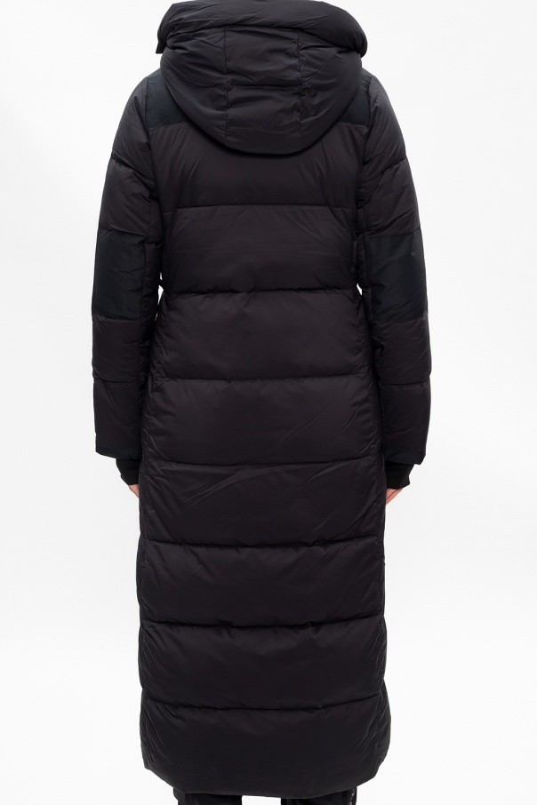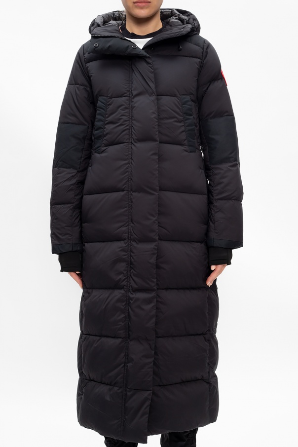 Black ‘Alliston’ quilted down jacket from Canada Goose. Fastened with a two-way zip and snaps, this garment is complete with a drawstring hood, two zip pockets, two snap pockets and a logo patch in red, navy and white on the sleeve. Temperature rating: -15°C to -25°C.