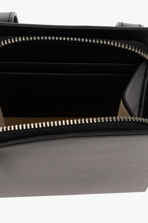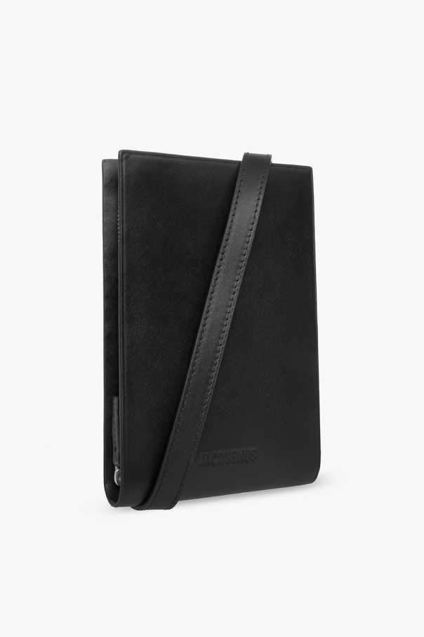 Black ‘Le Gadju’ phone holder from Jacquemus. Crafted from leather, this item features a zip fastening, an embossed logo on the front, a shoulder strap, silver-tone metal hardware and one internal compartment with three card slots.