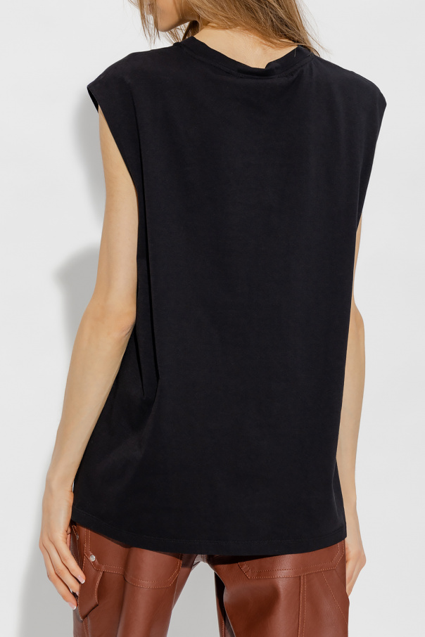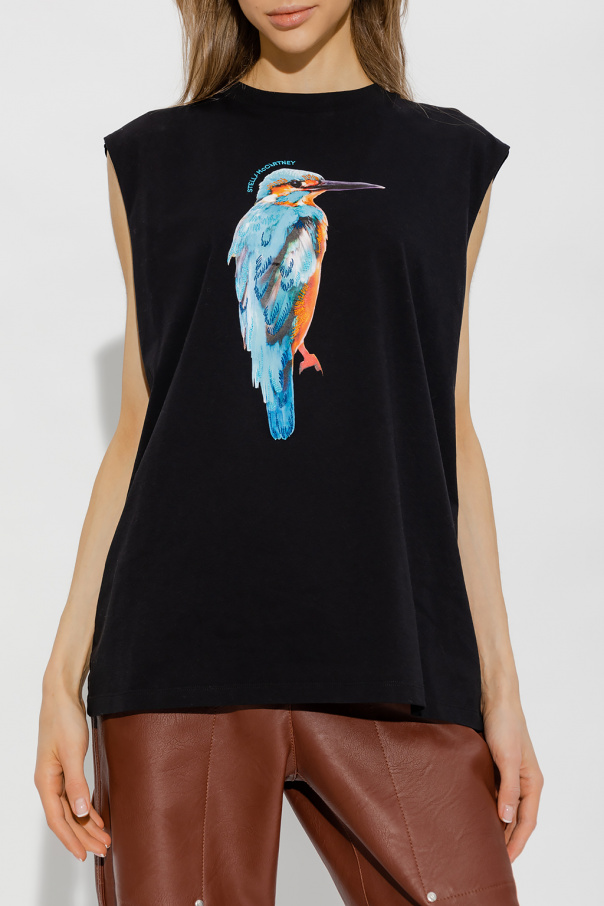 Black sleeveless T-shirt from Stella McCartney. Crafted from organic cotton, this style features a relaxed fit, an elasticated collar and blue embroidery accompanied by a colourful animal print on the front.