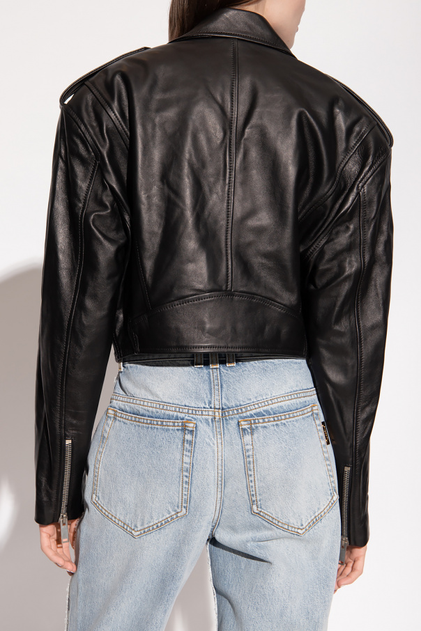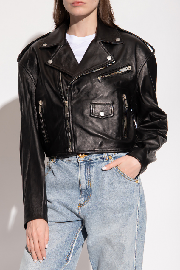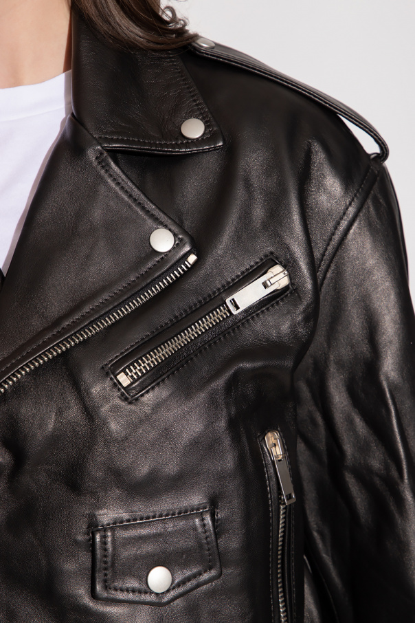 Black biker jacket from Halfboy. Made of leather, this garment features a zip fastening, epaulette details, three zip pockets, snap-fastened flap pocket, silver-tone metal hardware and long sleeves with a zip detail.