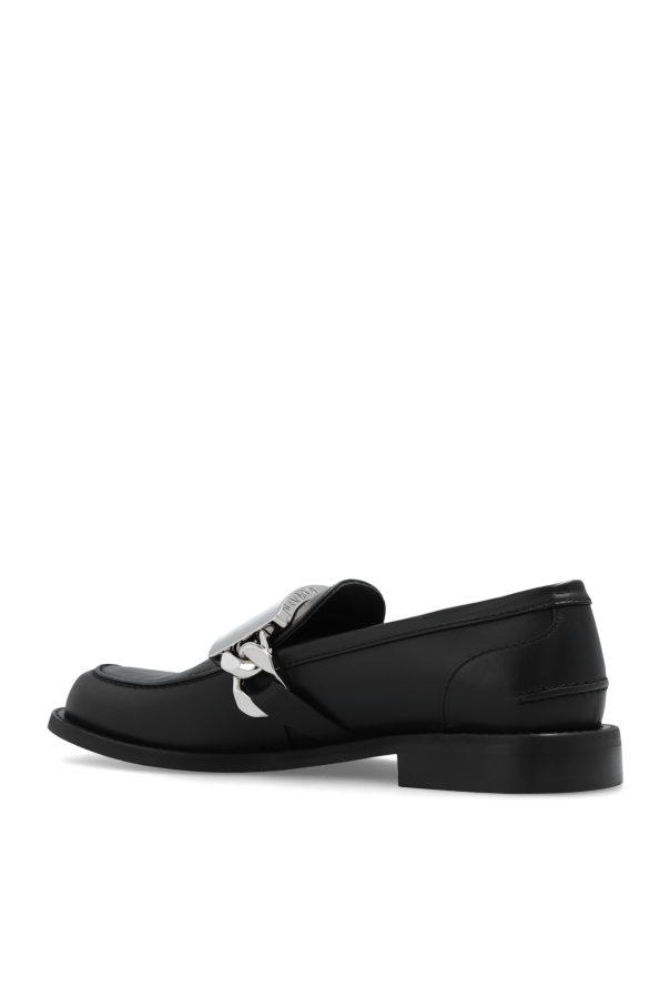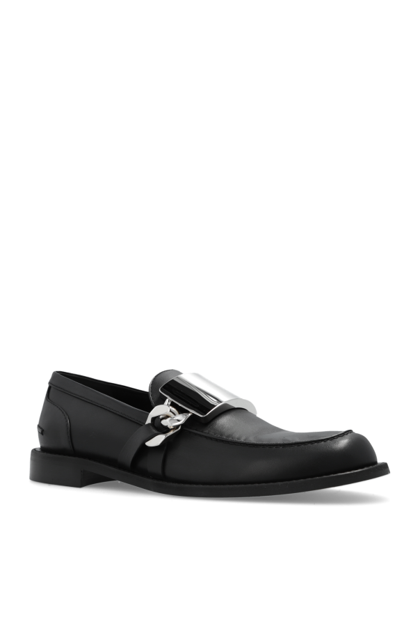 Black loafers from JW Anderson. Crafted from leather, this model sits on a black rubber sole and showcases silver-tone metal hardware with an engraved logo and chain detailing.