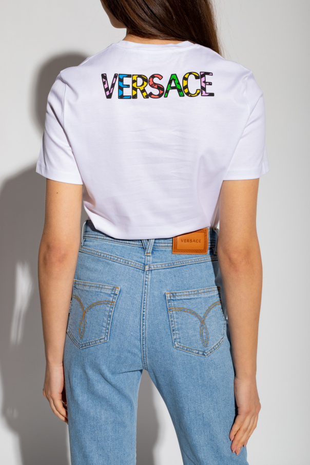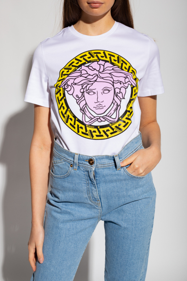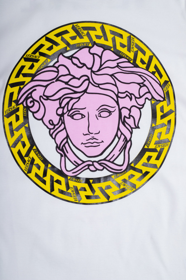 White crewneck T-shirt from Versace. Made of cotton, this style features short sleeves and a colourful graphic print with the brand\'s signature Greek pattern and Medusa motif.