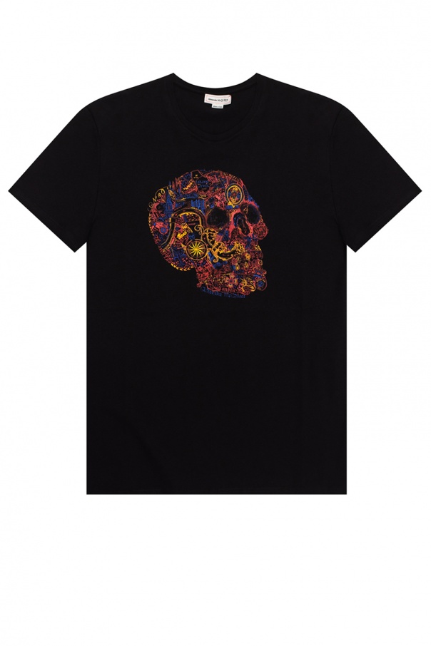 Black crewneck T-shirt from Alexander McQueen. Crafted from cotton, this design is decorated with a printed logo pattern in yellow, blue and red.