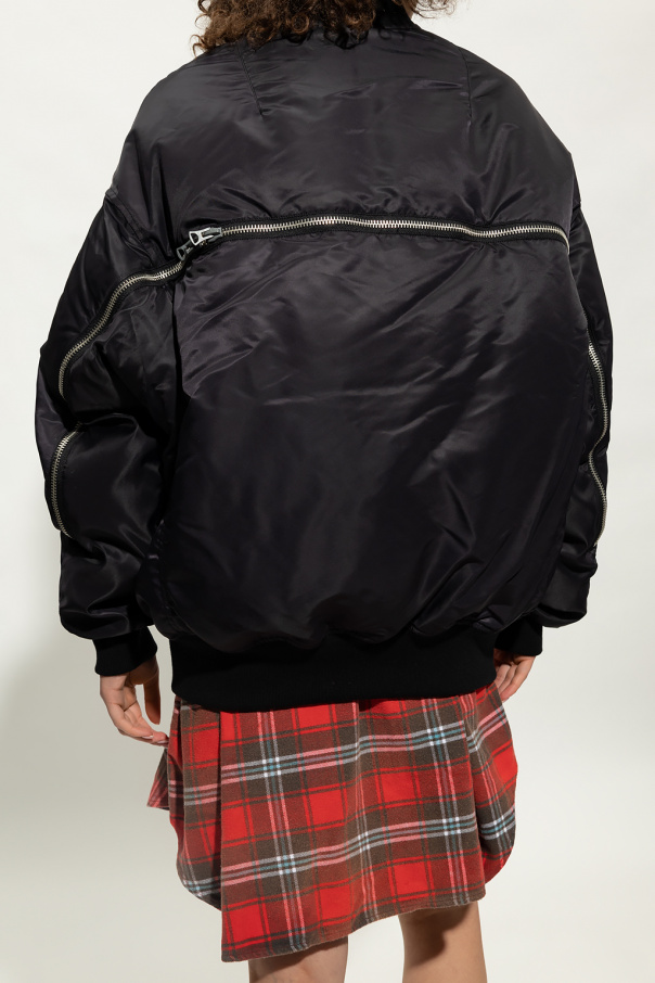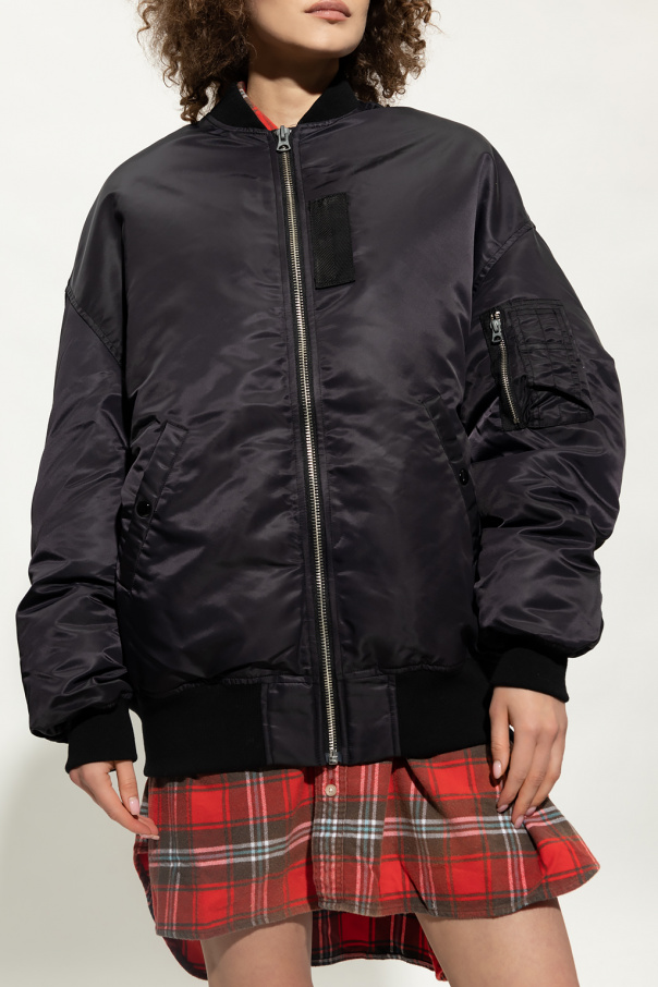 Black down bomber jacket from R13. Crafted from technical material with a satin finish, this style features a zip fastening, decorative snaps and a grosgrain strip on the front, two snap-fastened pockets on the front, zip vents on the back and shoulders, multiple sleeves pockets and ribbed trims on the collar, bottom hem and cuffs.