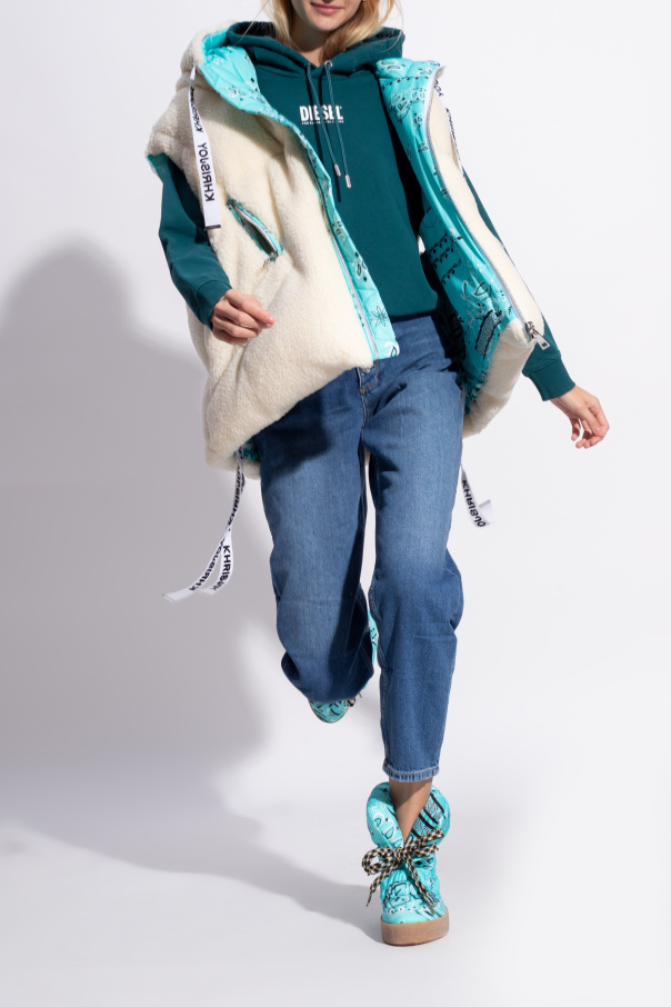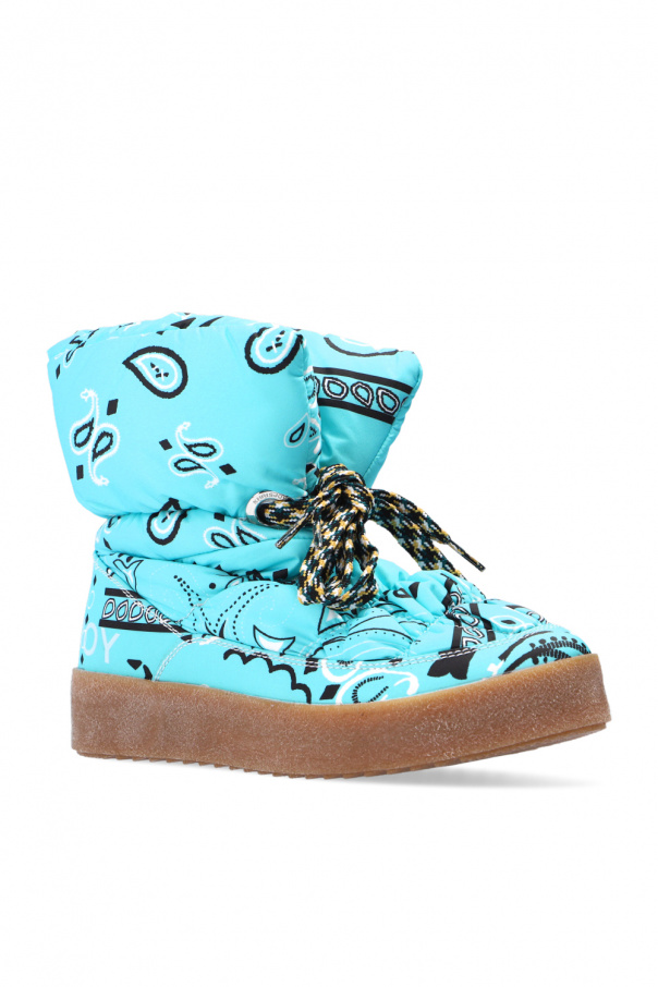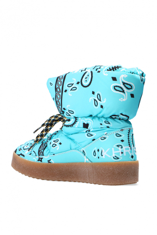 Blue, black and white snow boots from Khrisjoy. Embellished with a paisley motif, this lace-up model features a white logo print and a brown rubber sole.