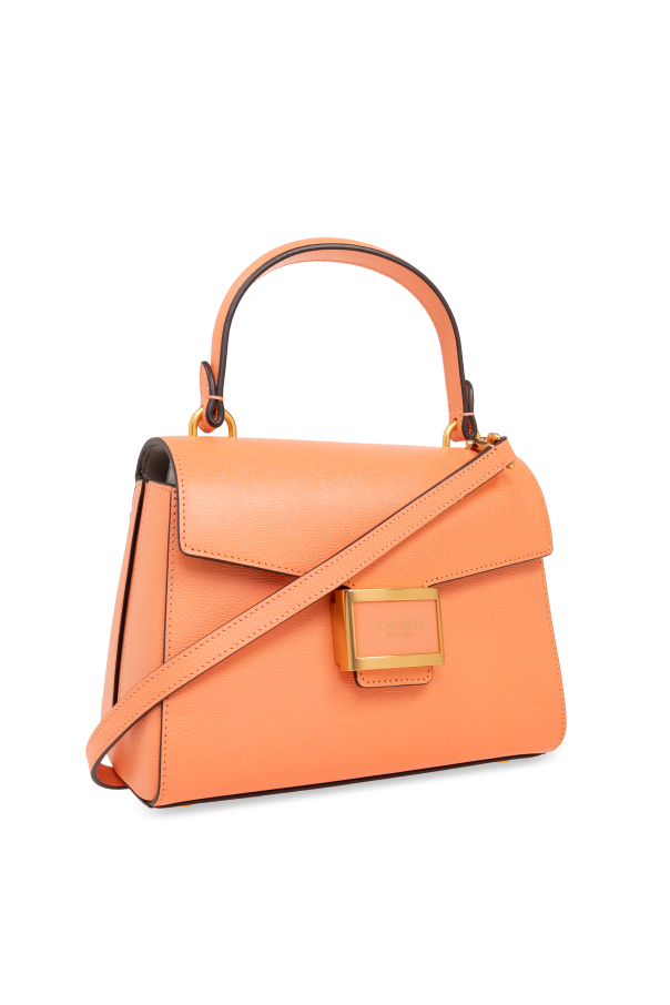 Introducing the \'Katy\' shoulder bag by Kate Spade, a quintessence of sophistication and functionality tailored for the discerning woman. Crafted with impeccable precision, this small shoulder bag radiates an aura of elegance in a vivacious shade of orange, reminiscent of coral hues. Its rectangular silhouette, with subtly rounded corners, stands testament to a design that marries classic aesthetics with modern minimalism. Constructed from the finest leather, the \'Katy\' exudes luxury with its smooth texture and uniform color. Accentuated by golden metallic details and the brand\'s iconic plaque, it presents an allure of exclusivity. The bag\'s rigid form ensures it retains its structure, projecting an image of refined grace. Functional versatility is at the heart of its design, featuring a hand-carry handle and a detachable, adjustable shoulder strap, offering multiple stylish carrying options. The interior, contrastingly lined with a premium material, is thoughtfully organized with a zippered pocket and an additional compartment for essentials, secured by a discreet magnetic snap closure. Why Purchase the \'Katy\' Shoulder Bag? Elegant coral-orange hue, perfect for adding a pop of color to any outfit. Luxurious, high-quality leather construction for lasting beauty and use. Flexible carrying options with both a handle and a detachable shoulder strap. Exclusive design elements including a gold-tone brand plaque and metallic accents. Practical interior layout with secure compartments for organization.