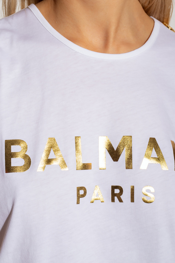 White sleeveless top from Balmain. Made of cotton with a relaxed silhouette, this style features a gold-tone logo print on the front, distinctive gold-tone metal hardware and binding details on the round neck and shoulders.