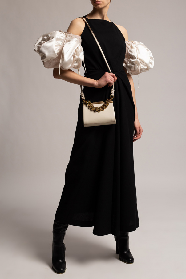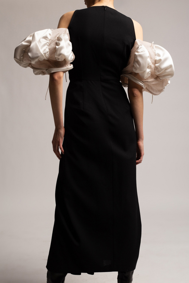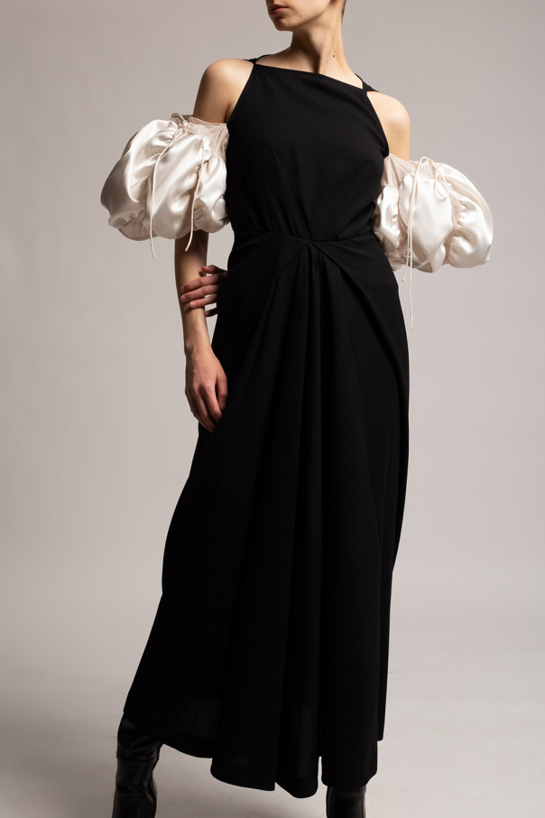 Black dress from Loewe. Crafted from a wool and cotton blend, this style features a hidden zip and a hook & eye closure at the back, decorative shoulder straps and denuded shoulders accentuated with cream, puffed sleeves with self-tie closures.