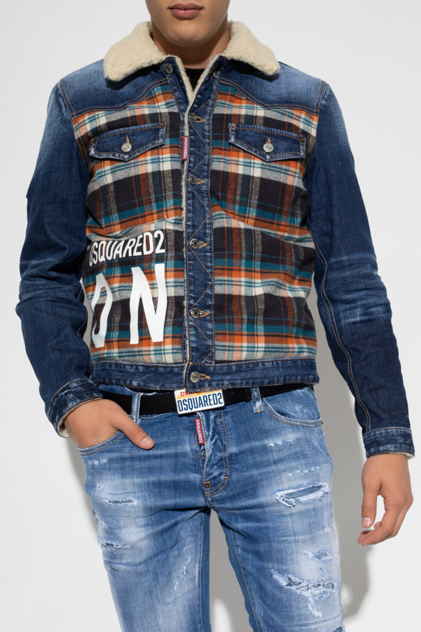 Navy denim jacket from Dsquared2. Fastened with buttons, this design features multicolored fabric with a check pattern, white logo print, two buttoned flap pockets, long sleeves with buttoned cuffs and cream faux fur lining and collar.