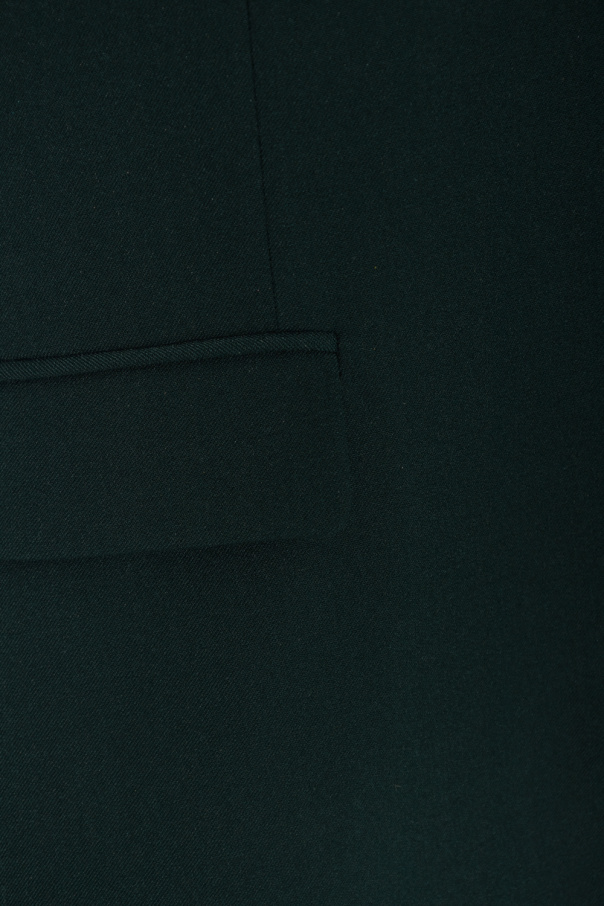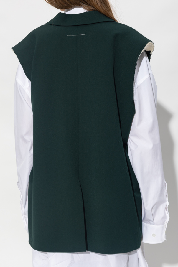 Dark green vest from MM6 Maison Margiela. Distinguished by raw trims, this style features button fastenings, notch lapels, padded shoulders, two flapped pockets, raw trims, a bottom slit and logo embroidery at the back.