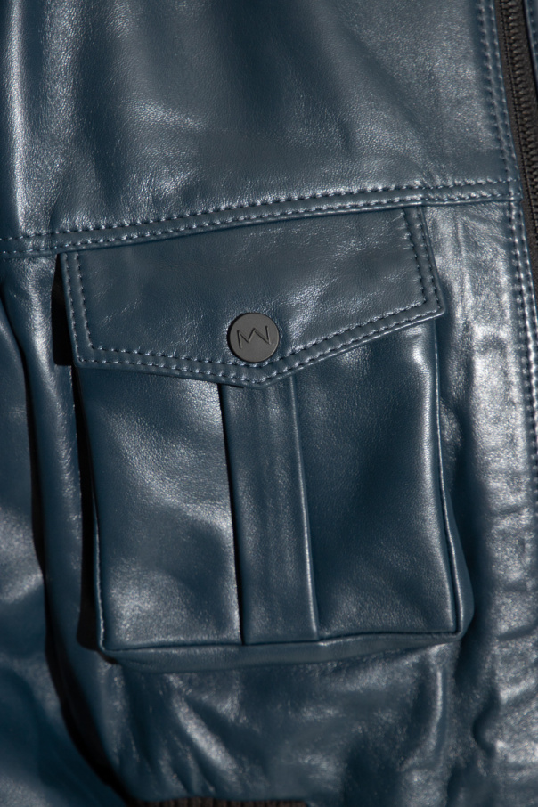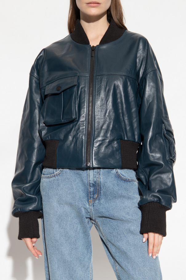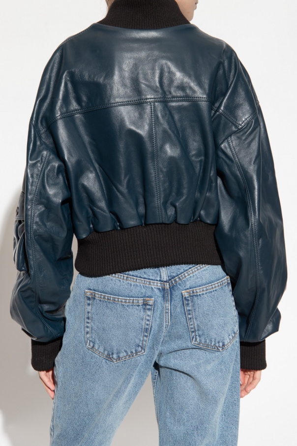 Navy blue ‘Le Mans’ bomber jacket from The Mannei. Crafted from leather with an oversize silhouette, this style features a zip fastening, two slip pockets, two snap-fastened flapped pockets and black ribbed trims on the collar, bottom hem and cuffs.