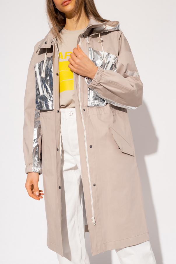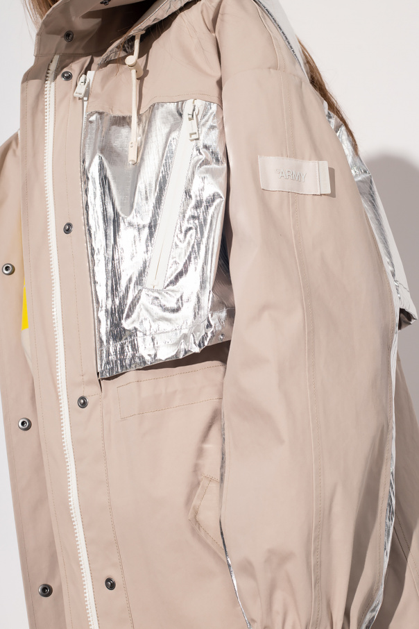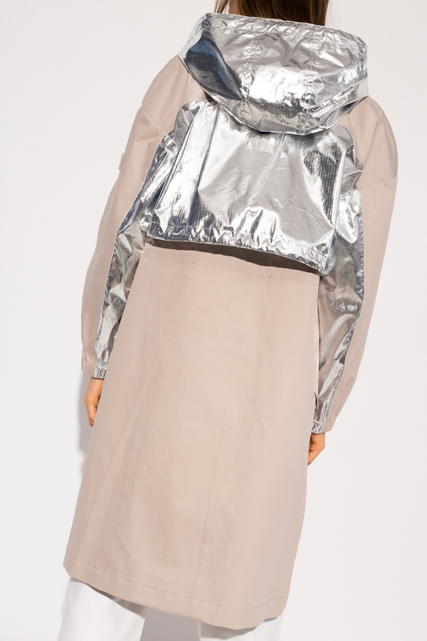Beige and silver-tone jacket from Yves Salomon. Crafted from different fabric panels assembled together, this style secures with a two-way zipper and snaps and features a drawcord-adjustable hood, two zipped pockets, two snap-fastened pockets, a logo patch and long sleeves with elasticated cuffs.