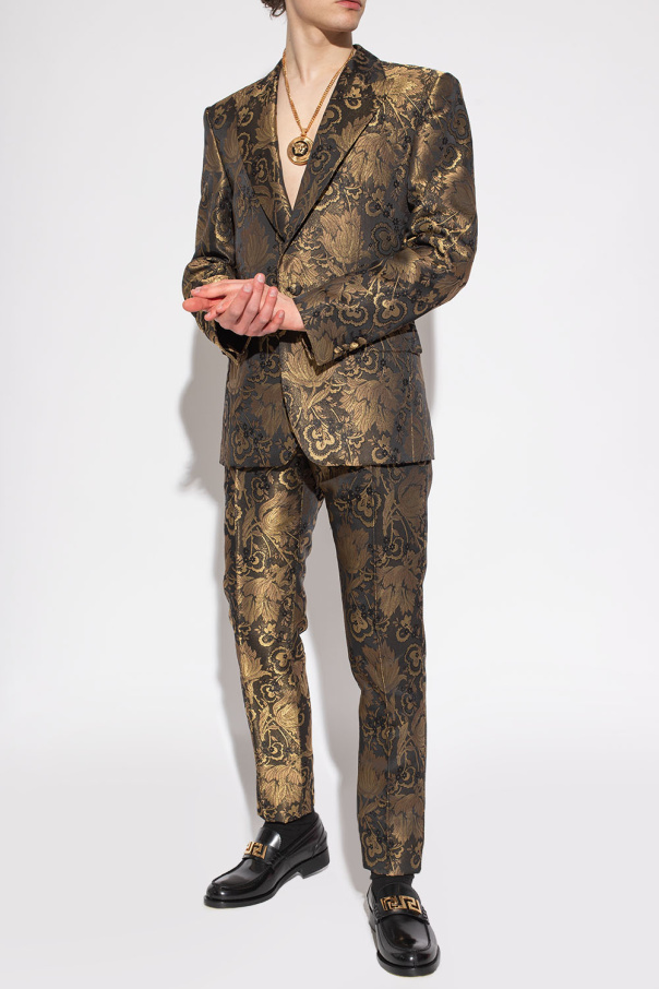 Black ‘La Greca’ loafers from Versace. Made of patent calf leather, this model sits on a black leather sole and showcases distinctive topstitching details and gold-tone hardware on the front.