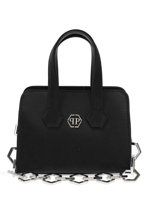 Black shoulder bag from Philipp Plein. Fastened with a magnetic snap, this model features a logo appliqué, three half-round handles, chain strap, one internal compartment and silver-tone metal hardware.