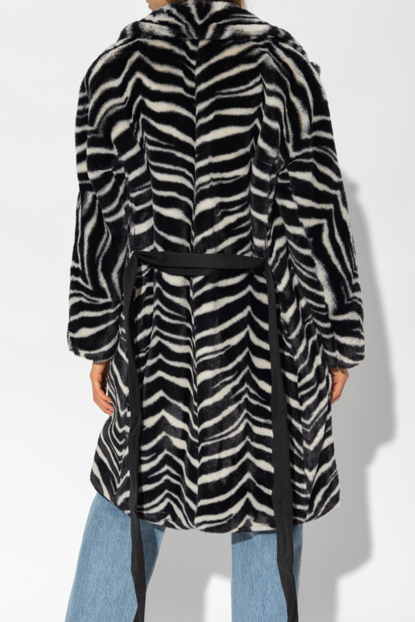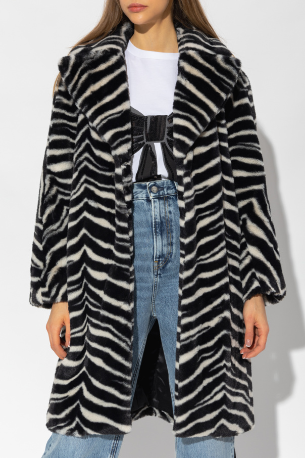 Black and white coat from Kate Spade. Crafted from faux fur with a zebra stripe motif, this style is cinched with a tie belt at the waist and features notch lapels, hook closures, two slip pockets and long sleeves.
