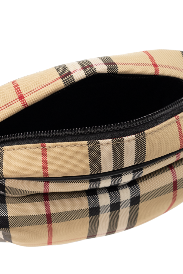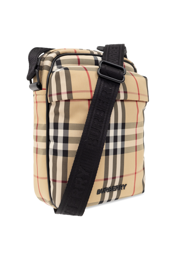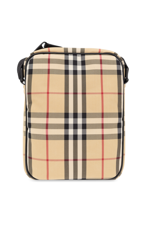 Beige ‘Freddie’ shoulder bag from Burberry. Embellished with the brand\'s signature check pattern, this design fastens via a zip and features an adjustable shoulder strap, one zip pocket accentuated with a logo plaque on the front, black metal hardware and one internal compartment.