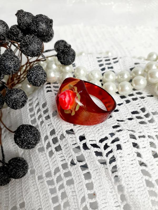 Вашему вниманию огромный перстень "Роза" из оргстекла с резным флористичным декором, нанесенным вручную! В СССР отечественный плексиглас — оргстекло был синтезирован в 1936 году в НИИ пластмасс (Москва) и с тех пор активно использовался для создания украшений, предметов быта, посуды и пр. Качественный, очень красивый, материал актуален и в наши дни! Перстень объемный, выполнен в форме шестигранника из цельного куска карамельного стекла.