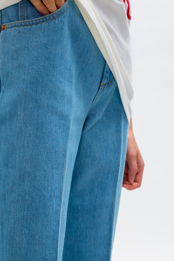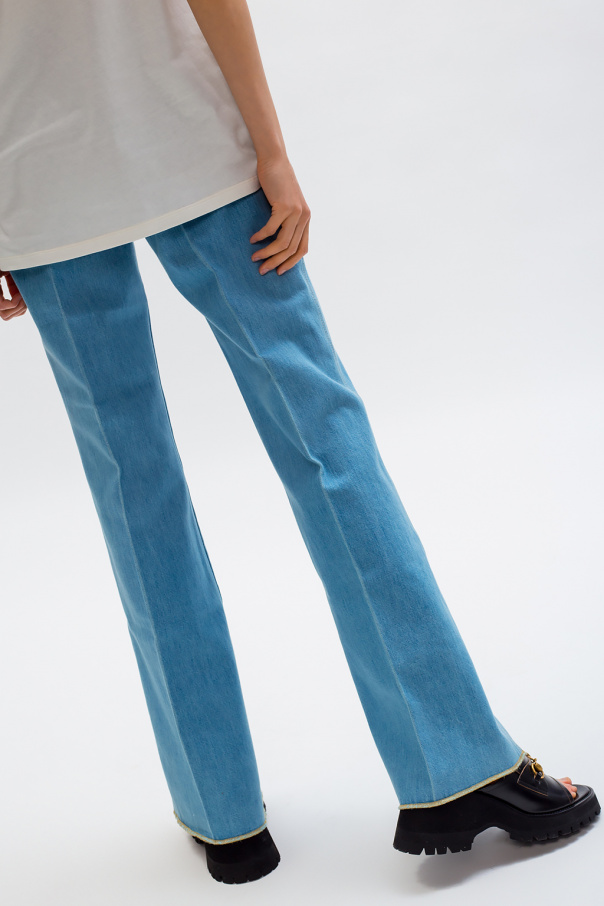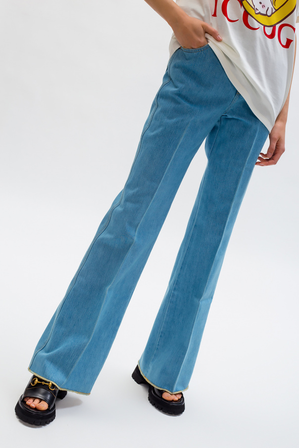 Light blue jeans from Gucci. Fastened with a zip and button, this pair falls down with flared legs and features yellow stitching details, a black logo patch made of leather, three front pockets and two back pockets.