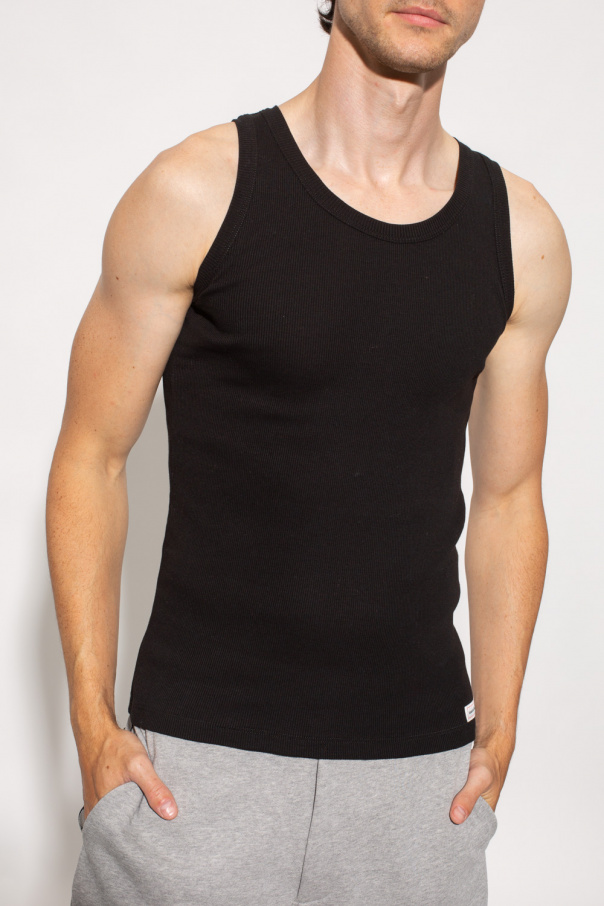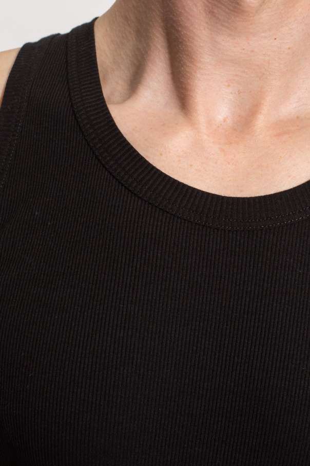 Black crewneck sleeveless T-shirt from Alexander McQueen. Made from cotton with a ribbed texture, this style features an elasticized collar and shoulders and a logo patch at the bottom hem.