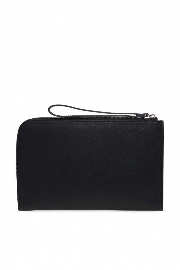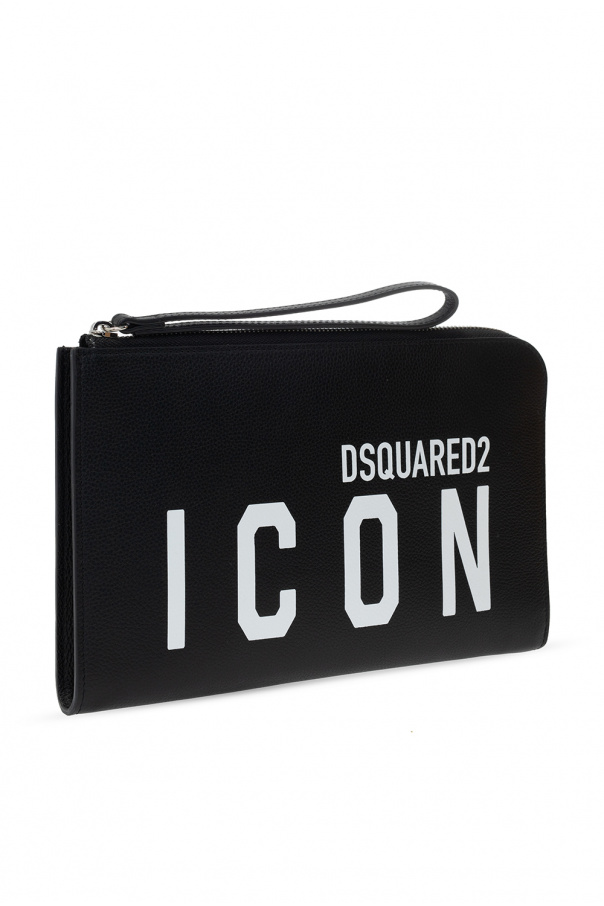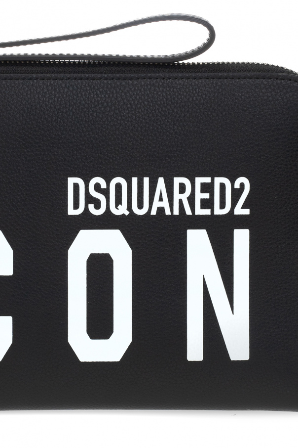 Black clutch from Dsquared2. Crafted from leather, this design features a zip fastening with a wrist strap, white logo print, silver-tone metal hardware, neon pink lining and one internal compartment with one slip pocket.