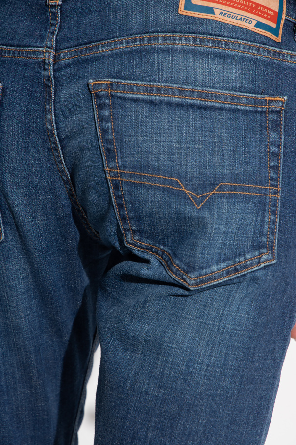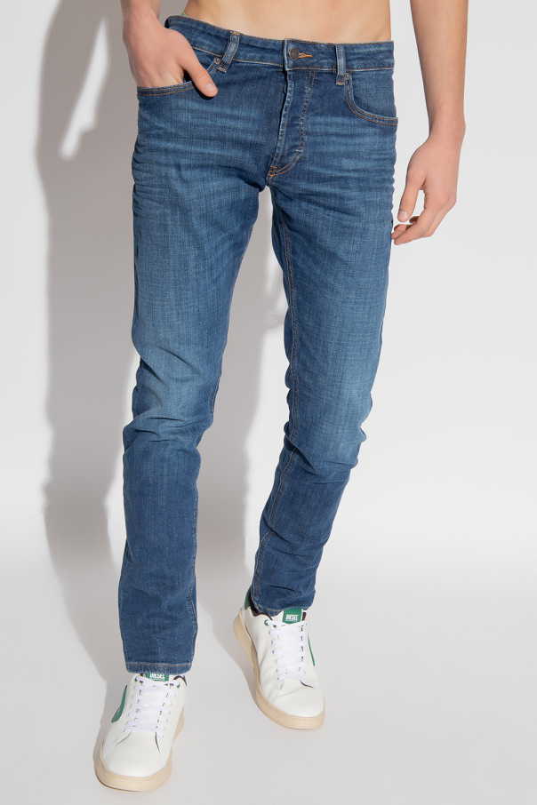Dark blue \'D-LUSTER L.32\' slim-fit jeans from Diesel. Falling with tapered legs, this pair features button closures, classic five pockets and logo patches on the front and back.