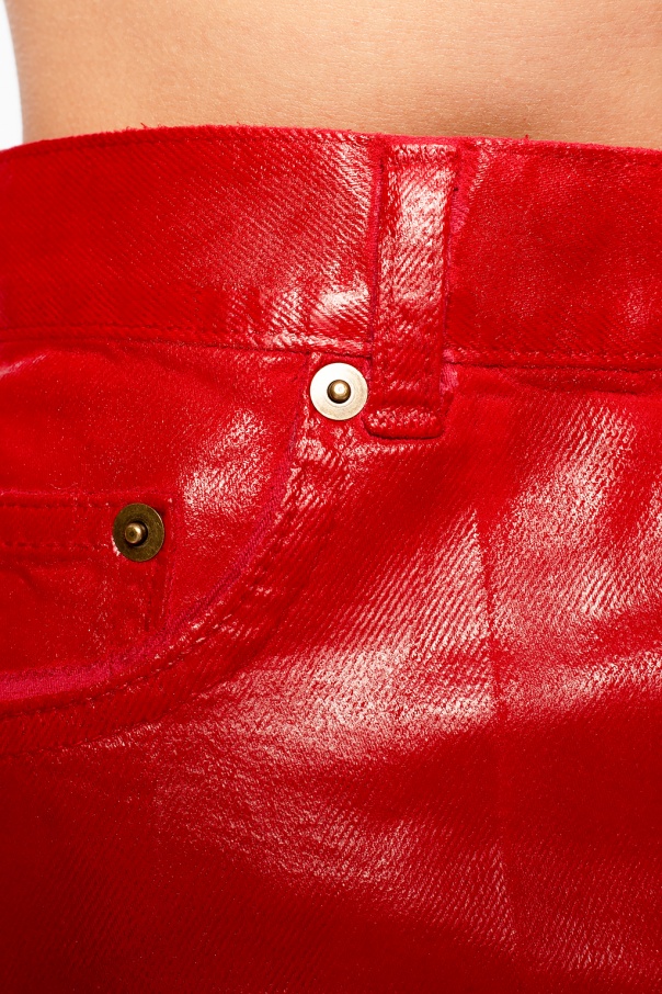 Red skirt from Saint Laurent. Crafted from waxed denim, this item features a zip and button fastening, two front pockets and two back pockets.