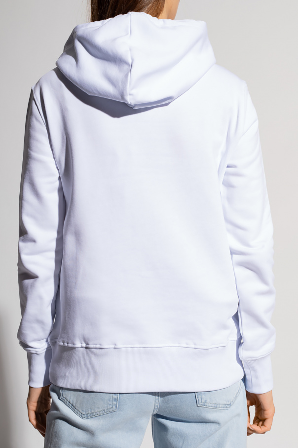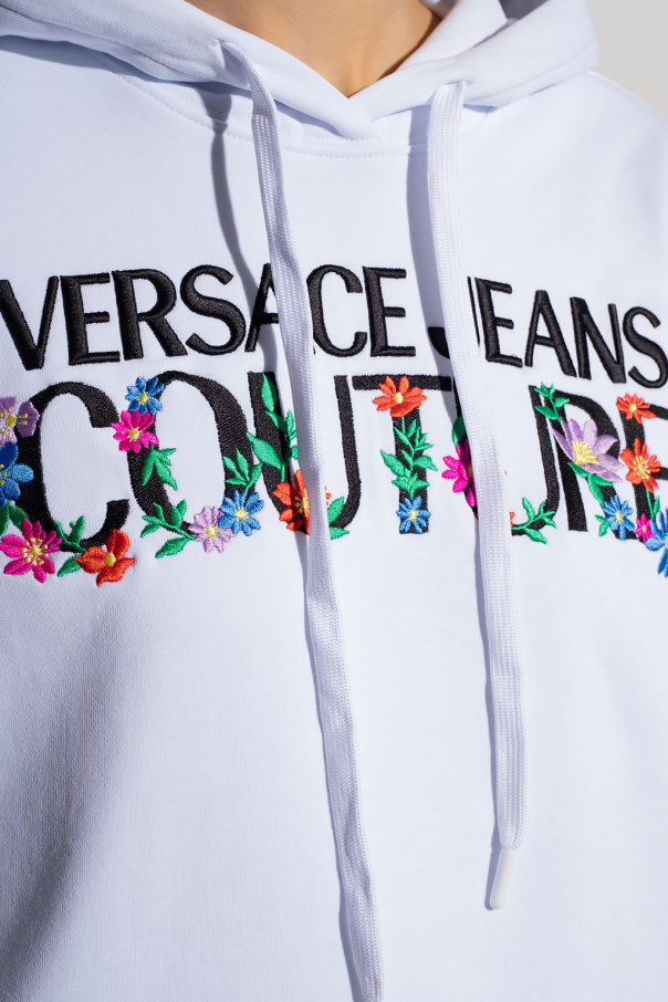 White sweatshirt with a drawcord-adjustable hood from Versace Jeans Couture. Crafted from cotton jersey, this style showcases black logo embroidery and colourful floral motif on the front and ribbed trims on the bottom hem and cuffs.