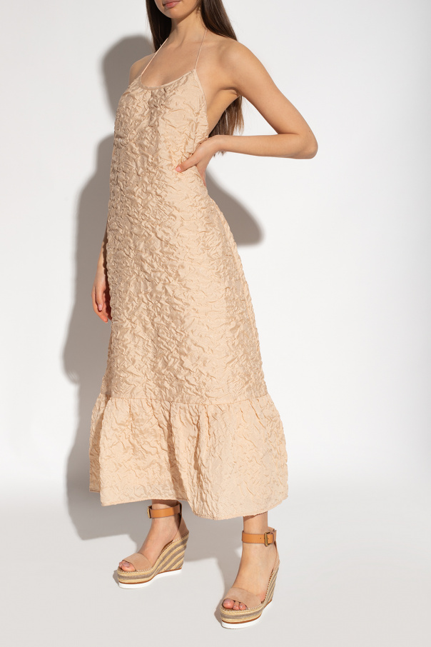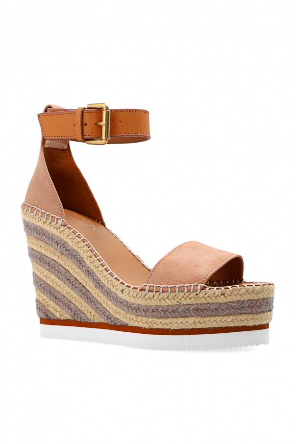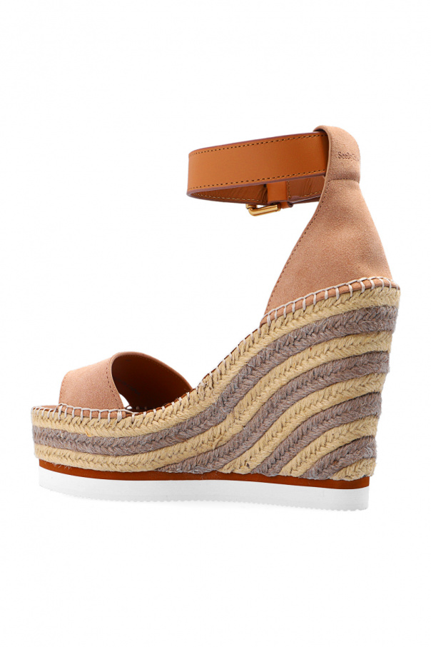 Beige ‘Glyn’ wedge sandals from See By Chloé. Made of suede, this pair features brown leather ankle strap with a buckle and rubber sole trimmed with jute in white, brown and beige.