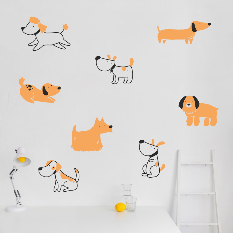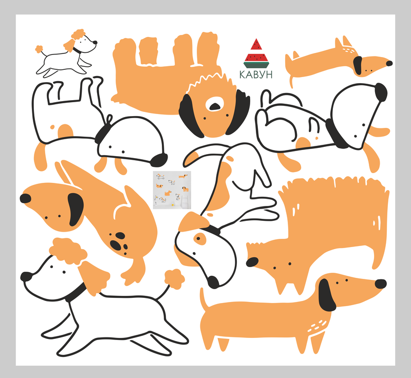 Виниловая интерьерная наклейка цветная декор на стену, обои и другие поверхности "Собаки рыжие и контурные"Предлагаем готовые наклейки для декора разных тематик. Наклейка представлена в виде вырезанных букв из высококачественной пленки Oracal или Ритрама. Буквы размещены к монтажной пленке и готовы к поклейке. Они хорошо ложатся на стекло (и не только), но заранее подготовленное. Данные изделия имеют множество положительных характеристик. Вот основные: