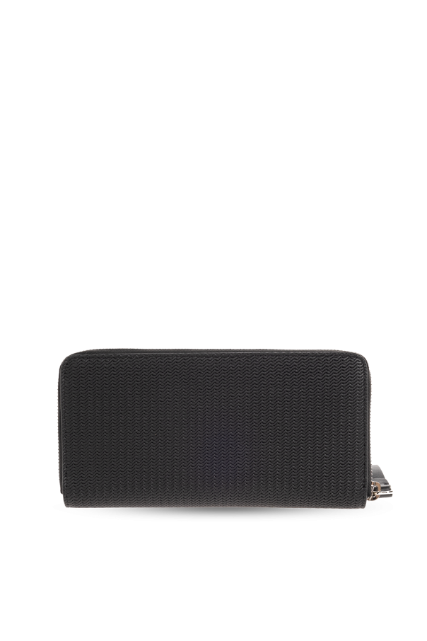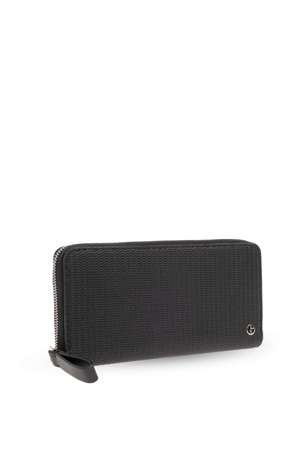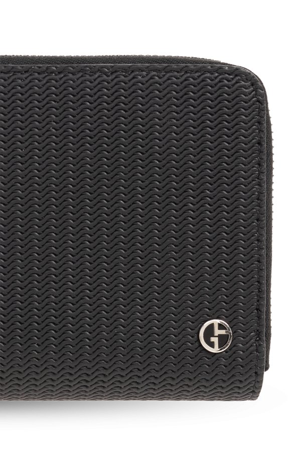 Black wallet from Giorgio Armani. Made of textured calf leather, this design features a silver-tone logo detail as well as two bill compartments, two slip pockets, eight card slots and one zipped coin pocket inside.