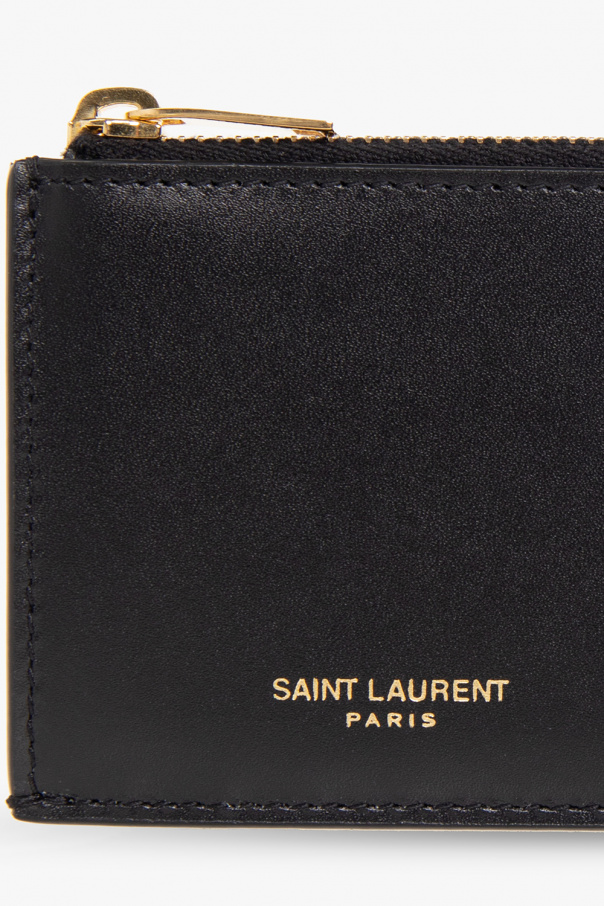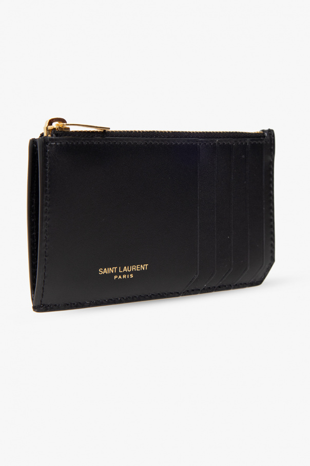 Black card holder from Saint Laurent. Crafted from calf leather, this item features a gold-tone logo print, five card slots and one zip pocket.