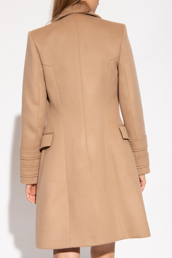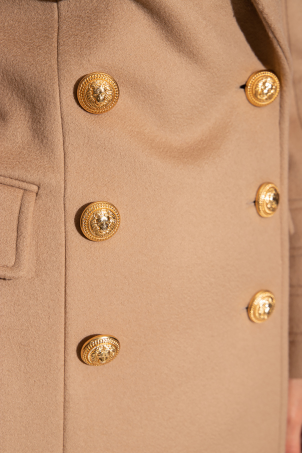 Beige double-breasted coat from Balmain. Crafted from wool with a form-fitting silhouette, this style features decorative gold-tone buttons with the brand's signature lion head motif, a lapel collar, two flapped pockets, a single back vent and long sleeves with decorative cuffs.