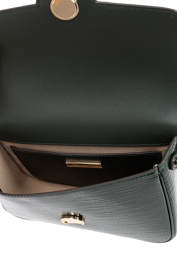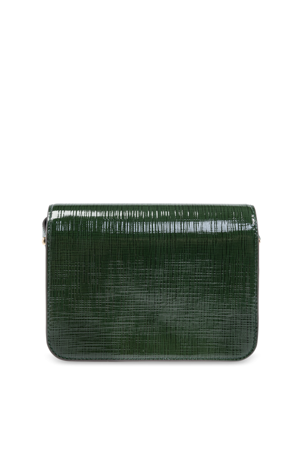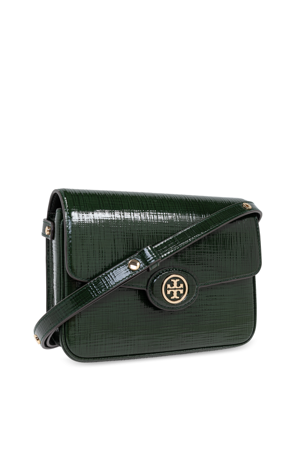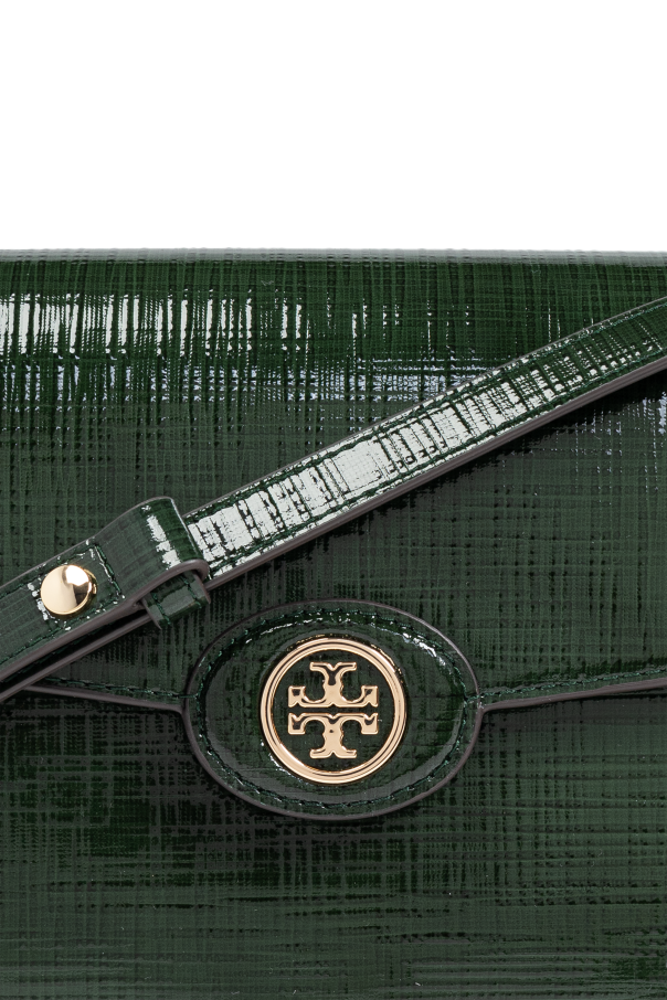 Introducing the \'Robinson\' Shoulder Bag by Tory Burch, a quintessence of luxury and functionality. This exquisite piece is crafted with an outer layer of premium leather, featuring an embossed crocodile pattern that exudes an air of sophistication. The deep green hue of the bag is strikingly complemented by a gold, circular logo prominently placed at the front, serving not only as a brand identifier but also as an elegant closure mechanism. The \'Robinson\' bag boasts a rectangular shape with rounded corners, enhancing its sleek and modern appeal. Its shoulder strap, adorned with a matching crocodile pattern, is adjustable through gold-tone metal buckles, allowing for a customized fit. The interior, lined with a high-quality darker material, likely leather, includes a compartment and a slip pocket for effortless organization of your essentials. The bag\'s non-zipper design, secured with a magnetic snap, adds to its seamless and secure usability. Why Purchase This Product? Elegant Design: The luxurious crocodile pattern and deep green color elevate your style quotient. Quality Craftsmanship: Constructed with premium leather and high-end materials for durability and a plush feel. Functional Elegance: Adjustable strap and internal compartment for comfort and organization. Iconic Branding: The gold-tone Tory Burch logo adds a touch of class and authenticity.
