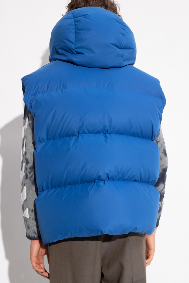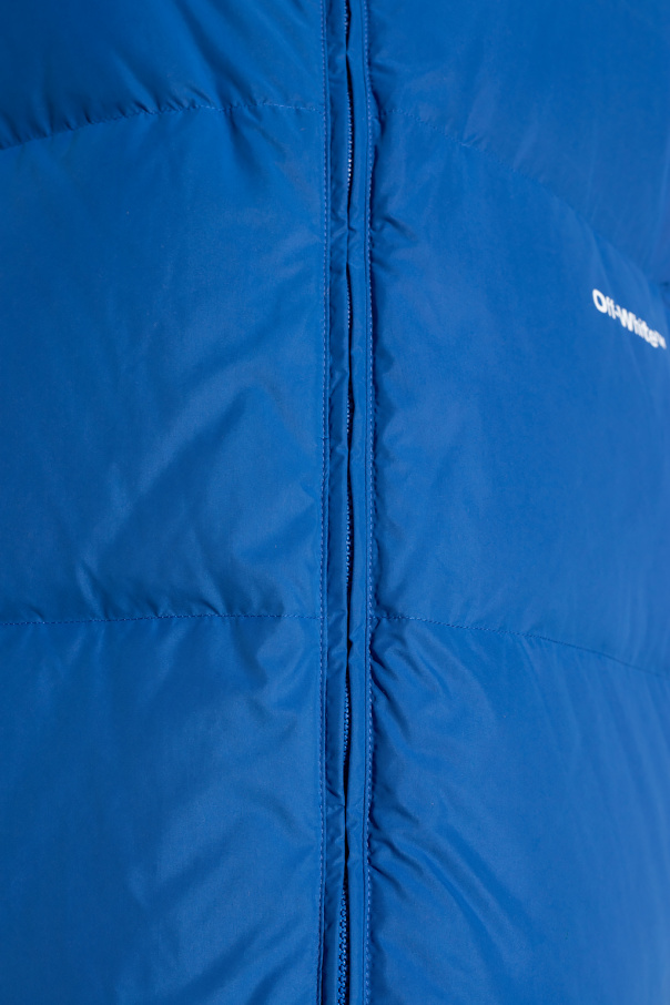 Blue down vest from Off-White. Equipped with a detachable drawstring hood, this style features two snap-fastened pockets accompanied by a printed white logo.