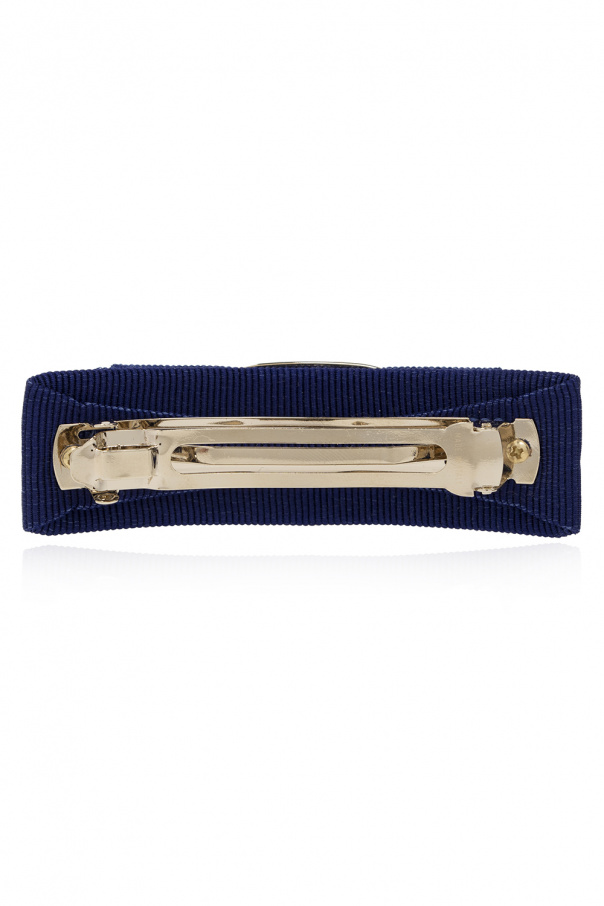 Navy and gold-tone bow hair clip from Salvatore Ferragamo. This item features a grosgrain strap and metal logo-engraved appliqué.