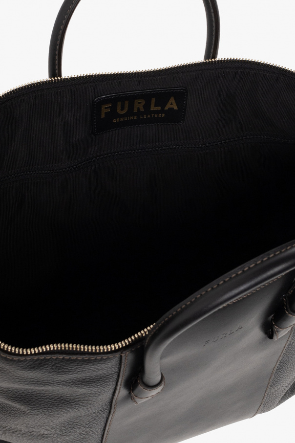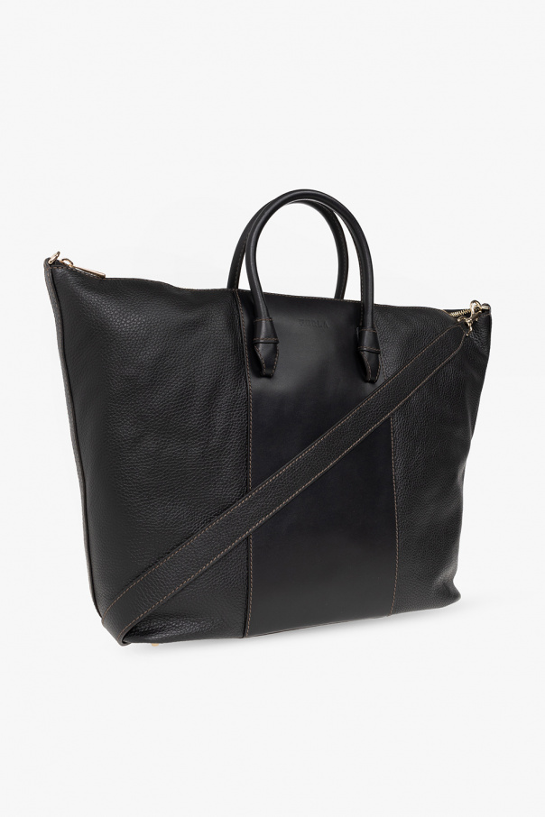 Black ‘Miastella Large’ shopper bag from Furla. Crafted from smooth and grained calf leather, this model features a zip fastening, embossed logo, two half-round handles, adjustable shoulder strap, light gold-tone metal hardware and one internal compartment with two slip pocket and one zip pocket.