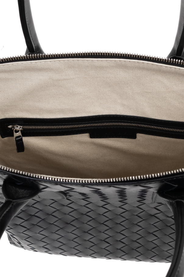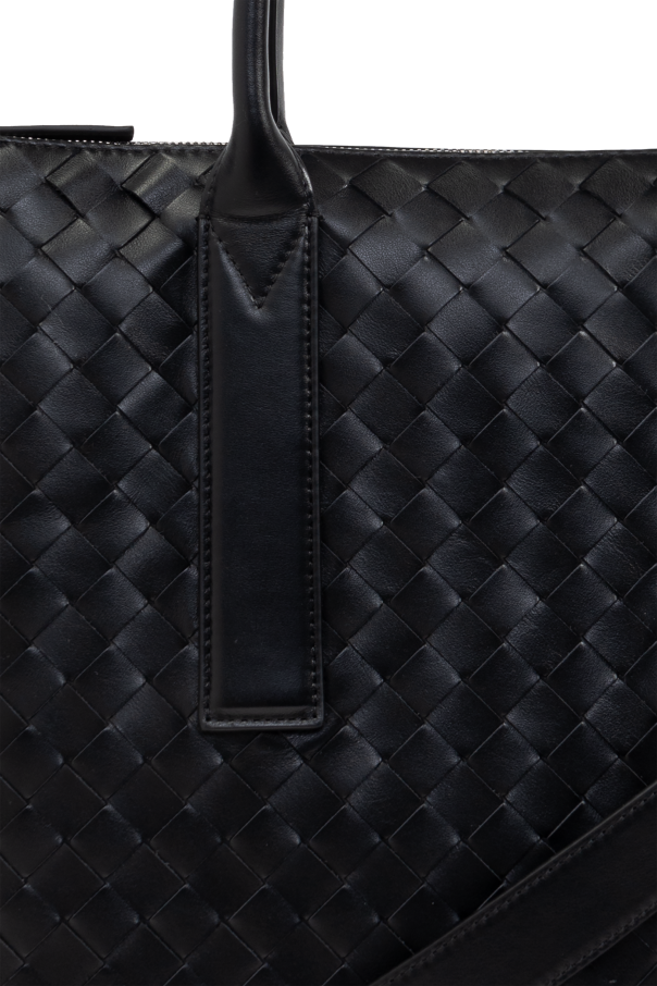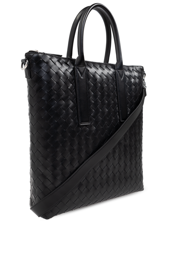 Introducing the North-South Shopper Bag by the illustrious Bottega Veneta, a testament to timeless elegance and exquisite craftsmanship. This rectangular masterpiece is a hallmark of luxury, crafted from high-quality black leather, intricately woven into a unique pattern that exudes sophistication. The exterior boasts two robust hand-held straps and an adjustable shoulder strap, offering versatile carrying options. Secured with a sleek zipper closure, this bag ensures your essentials are safely stowed. Inside, a light-textile lining complements the refined structure, featuring a zip pocket for added organization. Enveloped in classic black, this bag seamlessly marries functionality with aesthetic appeal, making it an ideal accessory for both formal affairs and everyday elegance. Why Choose This Product? Exquisite craftsmanship by renowned designer Bottega Veneta. High-quality black leather for a luxurious and durable finish. Unique woven pattern adds a distinctive touch. Versatile design with both hand-held and shoulder-carry options. Secure zip closure with organized interior featuring multiple pockets.