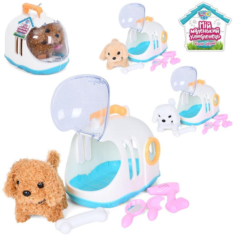 Собака 777-118B 15см, плюш, звук, ходит, подвижный хвост, кость, набор