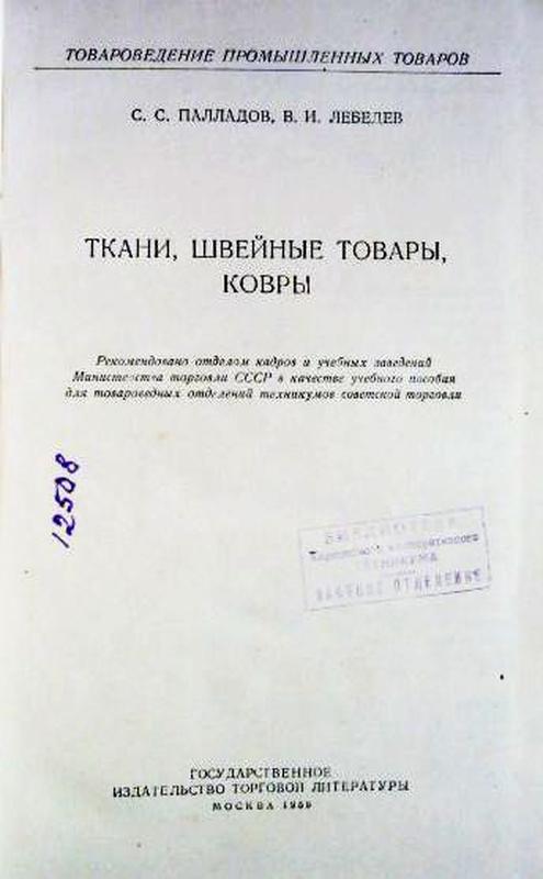Товароведение промышленных товаров. Ткани, швейные товары, ковры. С.С. Палладов, В.И. Лебедев. 1959г.