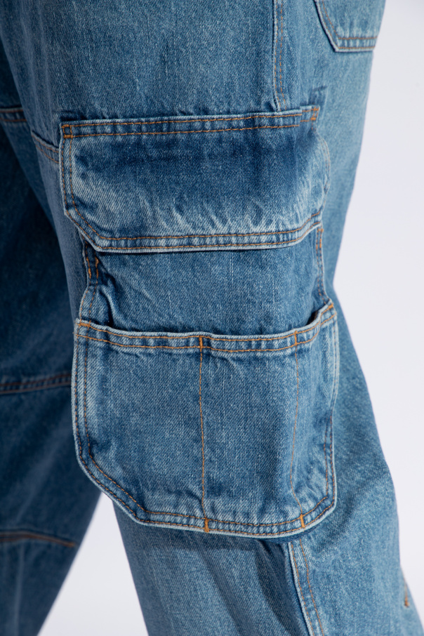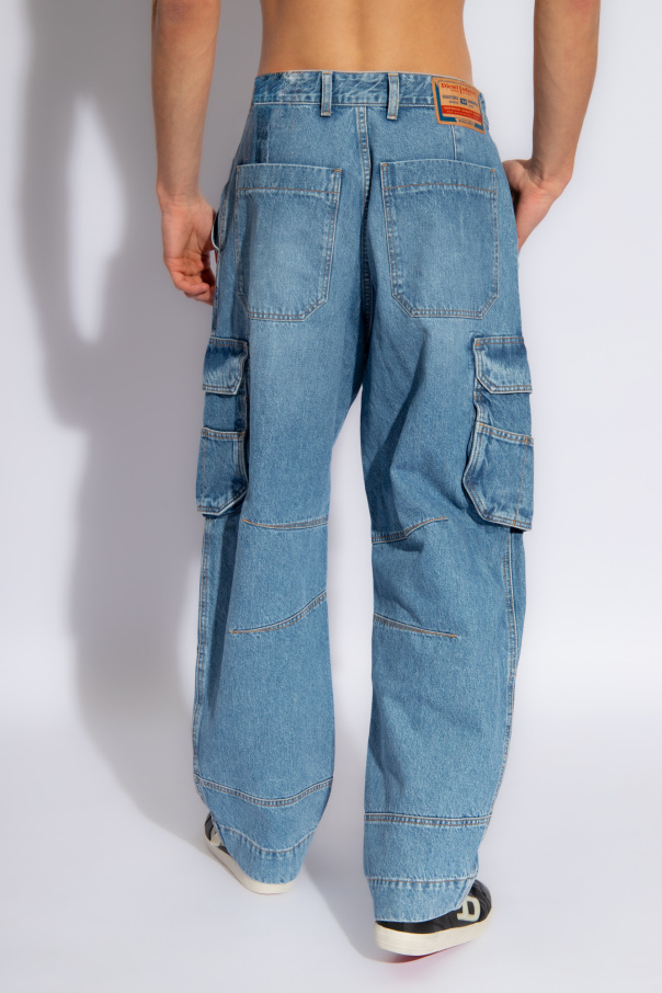 Blue ‘D-FISH-CARGO L.32’ mid rise jeans from Diesel. Fastened with a zip and button, this wide leg pair features a logo patch, five slip pockets and two snap-fastened flap pockets.