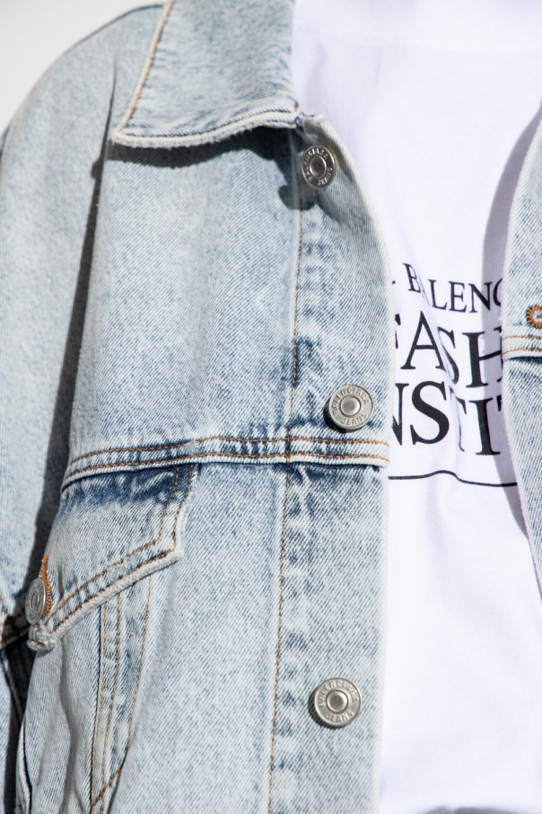 Light blue denim jacket from Balenciaga. Cut with an oversize silhouette and inlaid with light brown thread, this style features metal button closures, an embroidered light blue logo, two welt pockets, two flapped pockets with buttons and long sleeves with button cuffs.