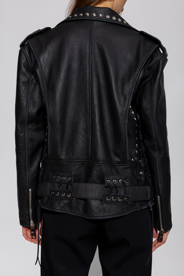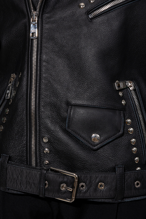 Black biker jacket Dolce & Gabbana. Made of leather and punctuated with silver-tone studs, this style features a zip fastening, buckle tabs at the waist, a logo application, decorative tie details on the sides, shoulders and hem, three zip pockets, one snap-fastened pocket and long sleeves with zipped cuffs.