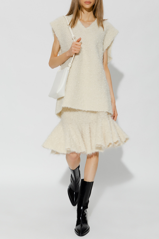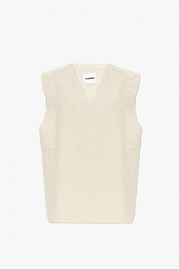 Cream vest from Jil Sander. Crafted from a mohair and silk with a distinctive knit pattern, this style features an oversize fit, a V-neckline and a back panel with a decorative bow.