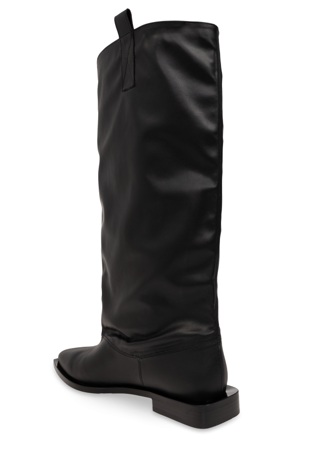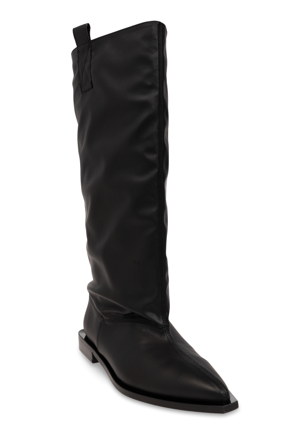 Introducing the quintessence of modern elegance and comfort: the Ganni Mid-Heel Slip-On Boots. Crafted with meticulous attention to detail, these boots exude sophistication with their sleek black hue and high-quality leather-like material. The seamless construction and clean lines accentuate the minimalist design, making them a versatile addition to any wardrobe. The boots feature a high shaft that gracefully extends to mid-calf or higher, depending on the wearer\'s leg length, accentuated with a subtle loop at the top back for ease of slipping on. The rounded toe and sturdy mid-heel offer a stable and comfortable stride, ideal for day-long wear. Notably, the absence of external zippers or fastenings enhances the boots\' streamlined silhouette, while the all-rubber construction ensures durability and longevity. Why Purchase This Product? Expertly designed by Ganni, a symbol of high-end fashion. Constructed entirely from high-quality, leather-like rubber for durability and ease of care. Minimalist and elegant design, free from overt branding, ensuring timeless appeal. Comfortable mid-heel and rounded toe for all-day wearability. Easy slip-on style with a helpful pull loop for convenience.