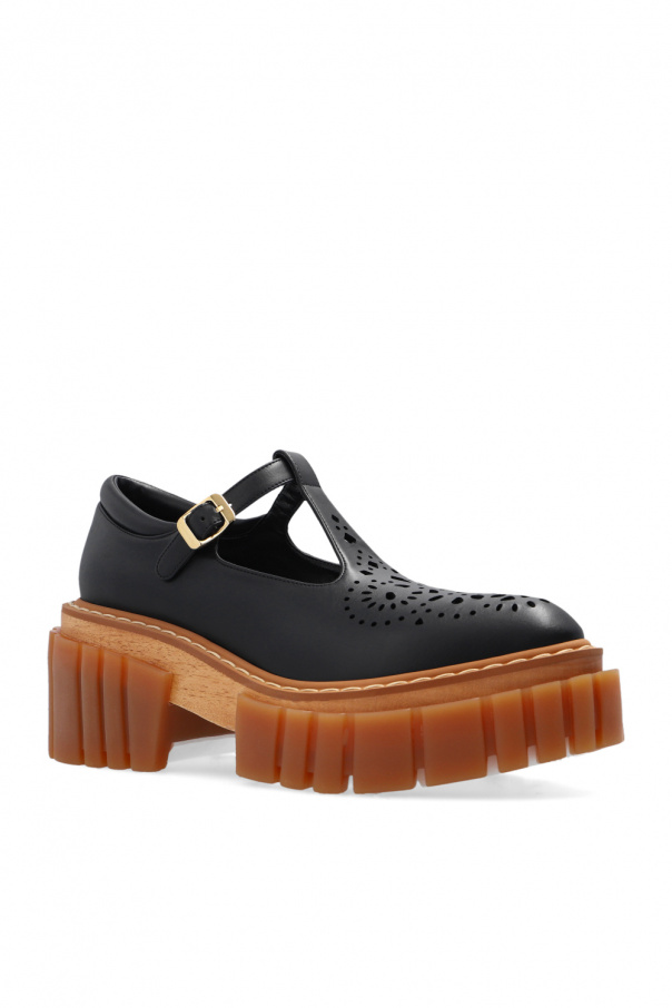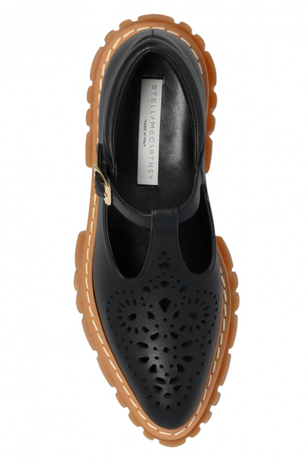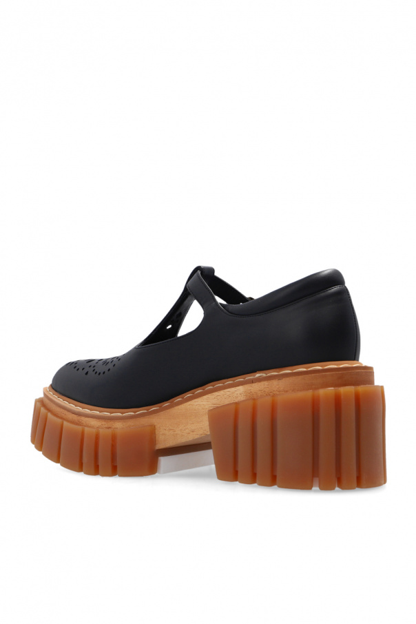 Black and brown ‘Emilie’ platform shoes from Stella McCartney. Crafted from faux leather, this pair is complete with a buckle strap, decorative perforations and wood sole with rubber trims in beige and white.