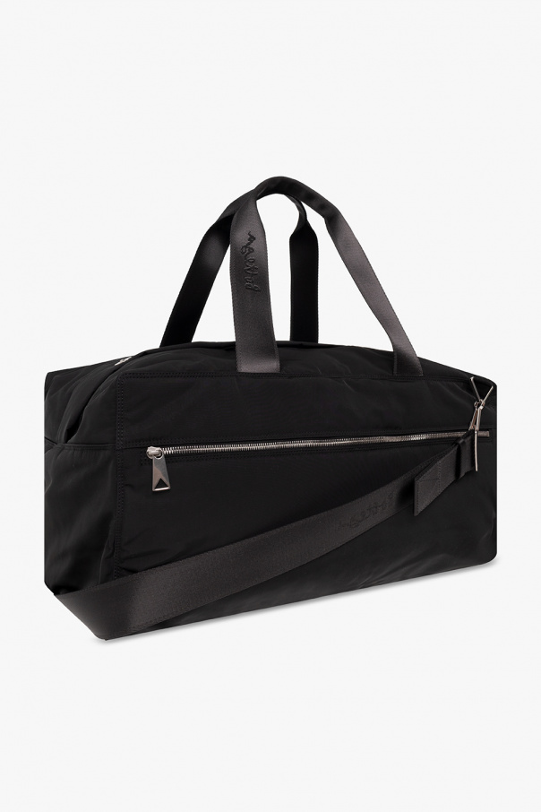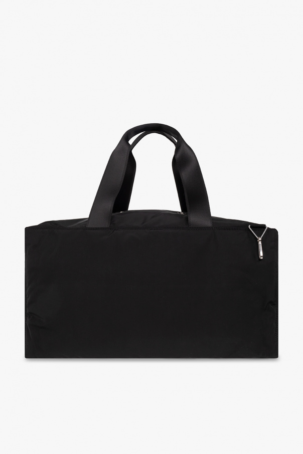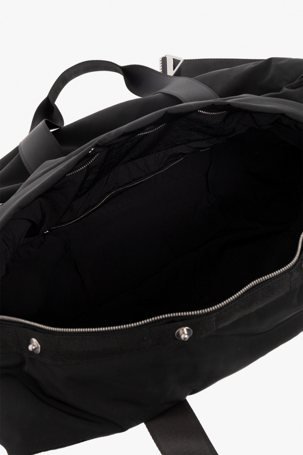 Black duffel bag from Bottega Veneta. Detailed with the brand\'s logo, this design secures with a two-way zipper and snaps and features two half-round handles, a detachable and adjustable shoulder strap, silver-tone metal hardware and one internal compartment with one zip pocket and two slip pockets.