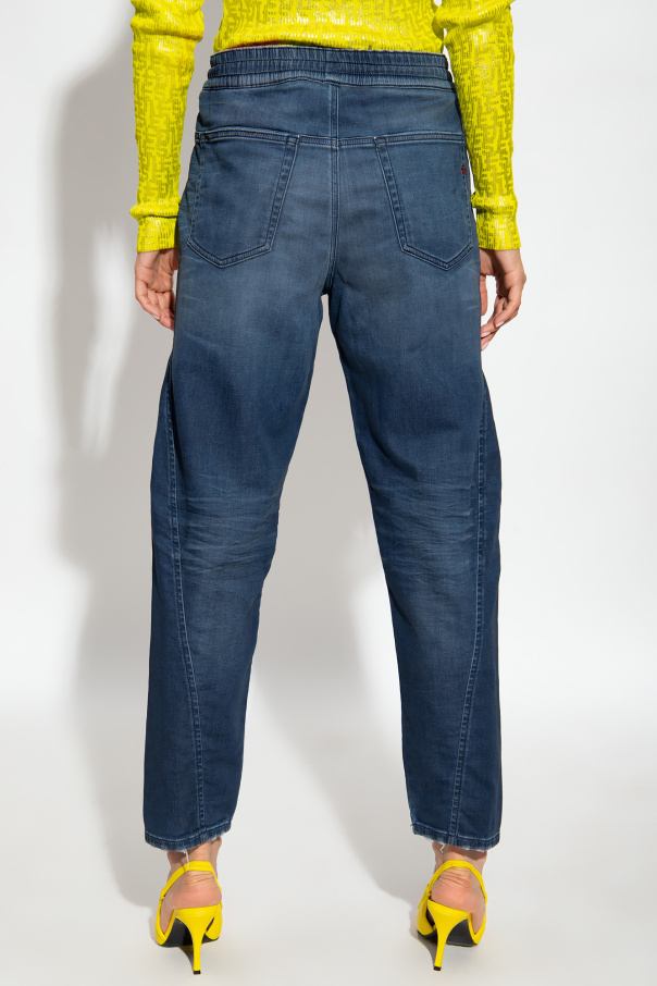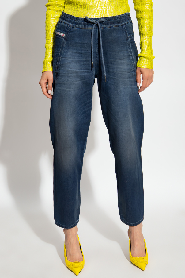 Dark blue ‘D-KRAILEY’ jogger jeans from Diesel. This pair features an elastic drawstring waistband, logo patch, red monogram embroidery at the back and four slip pockets.