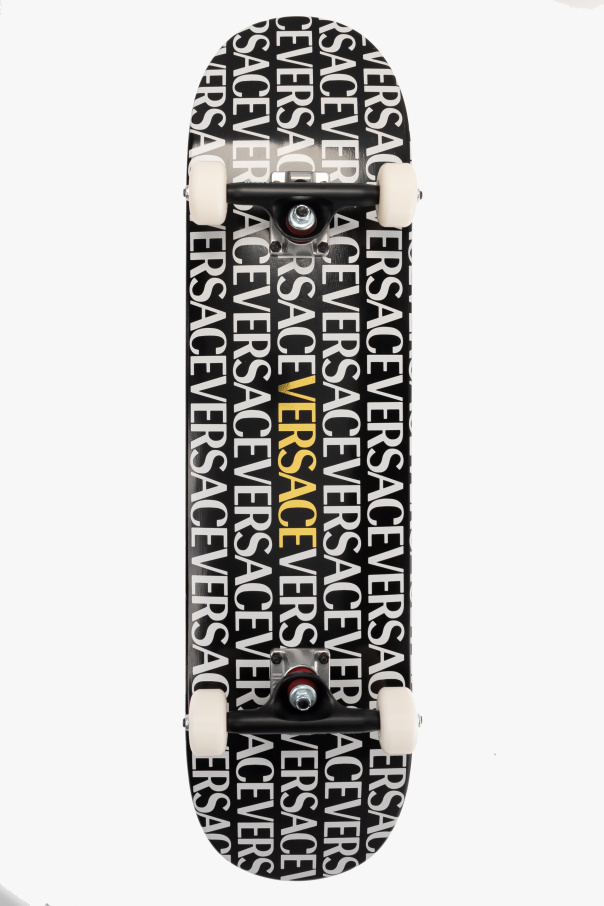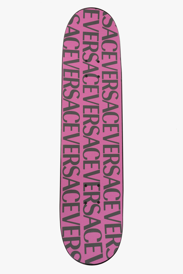 Pink, black and white skateboard from Versace Home. Crafted from high-quality wood, this skateboard is detailed with a Versace Allover motif and comes with a holder equipped with an adjustable shoulder strap.
