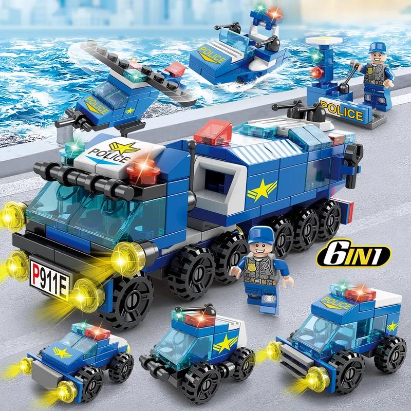 Собирается один большой грузовик с вертолётом на прицепе или 6 шт меньшего размера (машинки , пушка , катер , лодка ) один человечек тоже входит в набор.